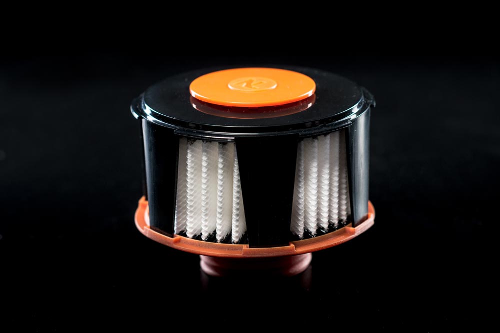 Samotná těsnost na rozhraní pevné části polomasky a filtru zajišťuje silikonový těsnící kroužek, který je ukotven do tělesa filtru. Tento kroužek díky svým vlastnostem, zajišťuje spolehlivé těsnění po celou životnost masky, jelikož nedochází k jeho vymačkávání a ztrátě pružnosti. Samotný kruhový filtr je řešen tak aby vyhovoval široké škále filtračních materiálů. Minimální normativně stanovená plocha filtru 150 cm2 z hlediska prodýchatelnosti, je bezpečně splněna a lze jí i výrazně navýšit zvětšením hustoty skladu filtračního materiálu.